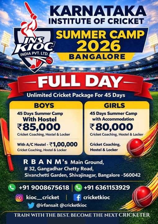Join KIOC’s full-day residential cricket coaching program in Bangalore with hostel, catering, and evening college support. 365-day professional cricket training open to students across India.